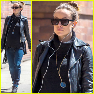 Olivia Wilde keeps her baby bump under wraps in a black leather jacket while going for a solo stroll on Wednesday (April 9) in New York City.