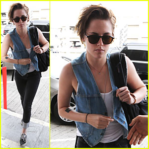 Kristen Stewart rocks a denim vest while catching a departing flight at LAX Airport on Wednesday (September 3) in Los Angeles.