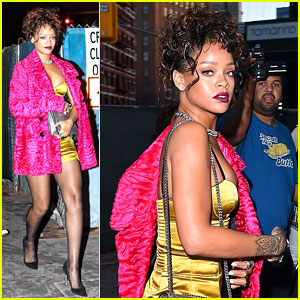 Rihanna makes a colorful statement in her pink jacket while stepping out for dinner on Thursday night (September 11) in New York City.