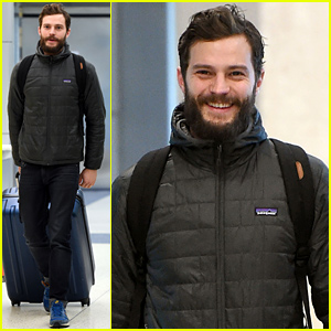 Jamie Dornan flashes his winning smile and shows off his scruffy beard while arriving at the airport on Thursday (February 5) in New York City.