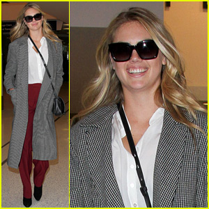 Kate Upton lands as LAX Airport with a big smile on her face on Monday (February 1) in Los Angeles.