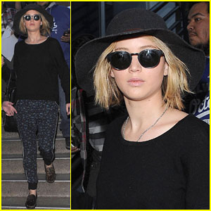 The 24-year-old The Hunger Games actress was just returning from a trip to New York City where she checked out her friend and frequent co-star Bradley Cooper on Broadway in The Elephant Man.