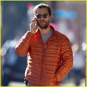 Matthew McConaughey chats on the phone in a puffy orange jacket and knife holster on Tuesday afternoon (February 10) in New Orleans, La.