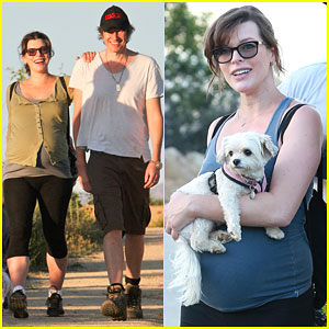 Milla Jovovich carries her adorable puppy on her baby bump during a hike on Friday afternoon (March 6) in Beverly Hills, Calif.