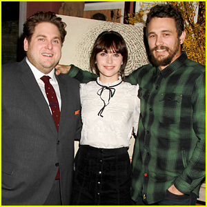 Felicity Jones, James Franco, and Jonah Hill all get together for a photo at a press event for their new film True Story on Tuesday (March 24) in New York City.