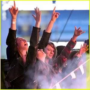 Taylor Swift throws her hands up with the girls of Haim while watching her boyfriend Calvin Harris‘ set during 102.7 KIIS FM’s 2015 Wango Tango at StubHub Center on Saturday (May 9) in Los Angeles.
