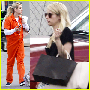 Emma Roberts steps on the set of Scream Queens wearing an orange jumpsuit on Tuesday afternoon (July 28) in New Orleans, La.
