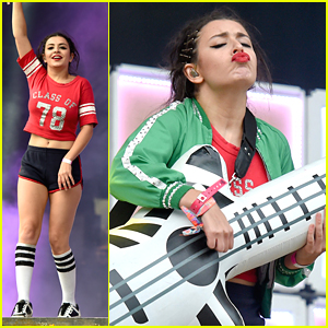 Charli XCX puckers up her lips while playing a giant inflatable guitar during her concert at Collins Music Hall in London, England on Thursday night (September 10).