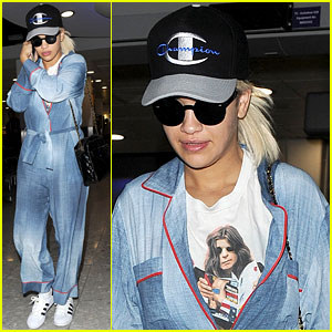 Rita Ora keeps a low profile in a pajama outfit while arriving at Heathrow Airport on Saturday (October 17) in London, England.