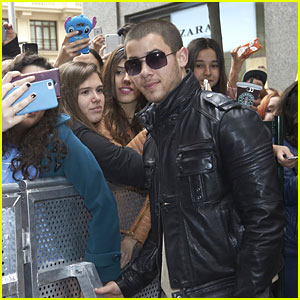 Nick Jonas makes time for the crowd of fans outside a radio station on Saturday (May 14) in Madrid, Spain.