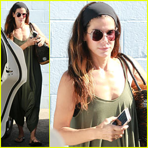 Sandra Bullock looks comfy and trendy in a green jumpsuit as she runs errands with her six-year-old son Louis (not pictured) on Friday (August 19) in Burbank, Calif.