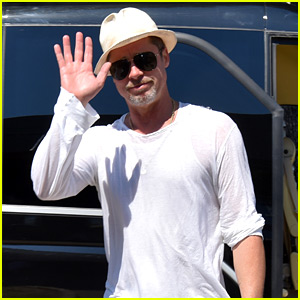 Brad Pitt waves to photographers as he gets out of a van and heads to a private plane at Nadar Airport on Friday (September 2) in Zadar, Croatia.
