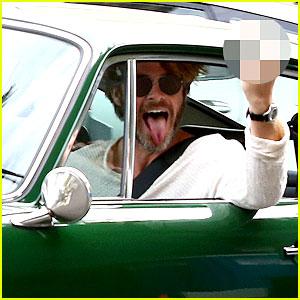 Chris Pine sticks out his tongue and holds up his middle finger while driving away following a newsstand stop on Thursday (October 27) in Hollywood.